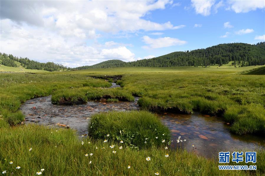 夏日時(shí)節(jié),新疆哈巴河縣薩爾布拉克鎮(zhèn)高山牧場(chǎng)水草豐茂,風(fēng)景如畫(huà)。