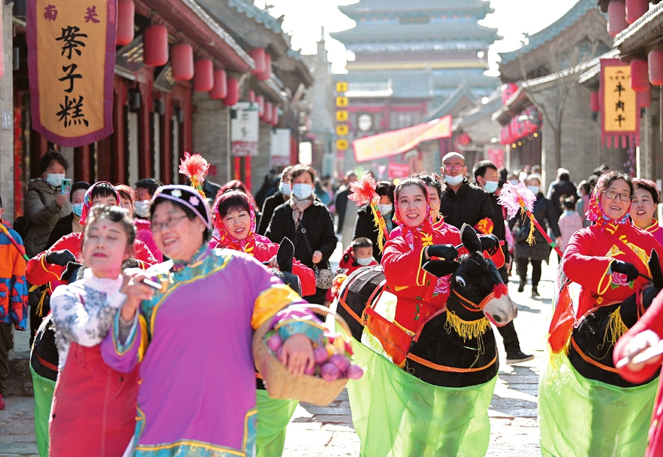2月17日,忻州古城,民間文藝表演隊(duì)正在街頭巡演。春節(jié)期間,忻州古城舉辦“逛古城、品文化、識(shí)忻州”旅游文化活動(dòng),雄獅起舞、八音吹奏、秧歌表演等一系列富有當(dāng)?shù)靥厣拿耖g文藝活動(dòng)精彩紛呈,吸引了眾多旅游者游覽觀賞,整個(gè)古城呈現(xiàn)出一派喜慶祥和的節(jié)日氣氛。