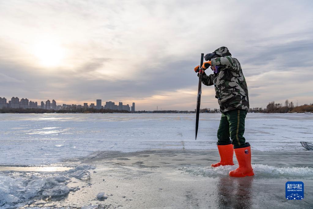 12月6日,工人在松花江哈爾濱段封凍的江面上采冰。