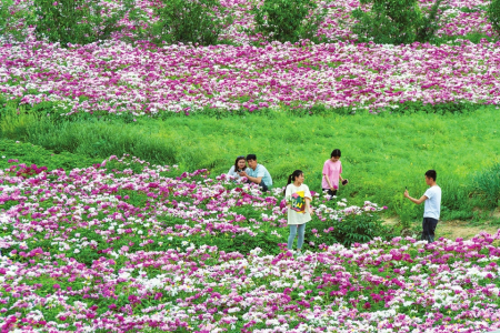 5月2日,游客正在平陸縣太陽(yáng)渡村盛開的芍藥花田中賞花游玩。姜樺攝