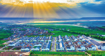 黃河萬榮段河流與移民新村相映成畫。