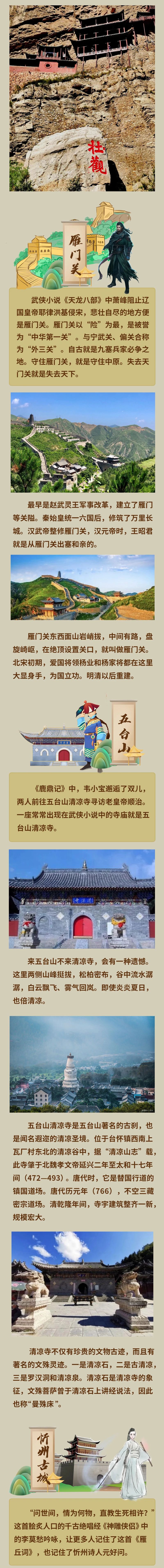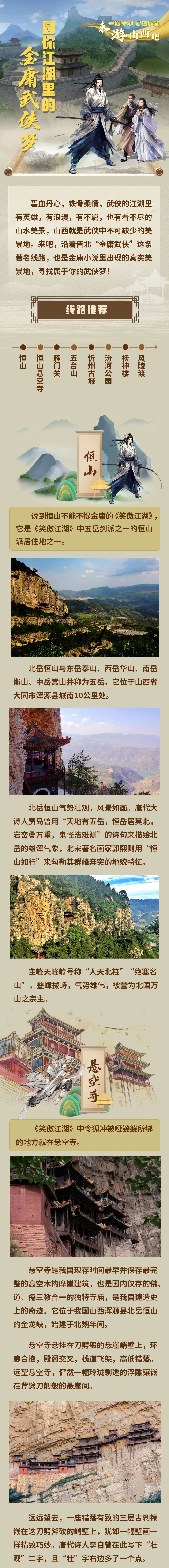 2023山西國風文化月已經(jīng)啟動,啟動儀式上發(fā)布的“金庸武俠線路”“詩詞名篇線路”“國家寶藏線路”三條國風文化線路備受關注??次鋫b、讀詩詞、賞國寶,國風山西到底怎么玩兒?三張長圖帶你走一遍!