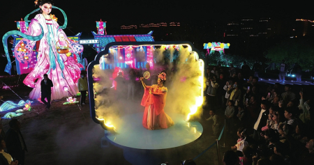 在百花的傳說中,十二月令花神的傳說最令人神往。在桃花島上,梅花、杏花、桃花、牡丹、石榴、蓮花、蜀葵、桂花、菊花、木芙蓉、山茶、水仙,各路花神身著華服,在所屬花燈前翩翩起舞,燈光人影交織,盡顯浪漫。“十二花神”每晚分時段在桃花云臺,跳起如云似幻的祈福舞,笑容明媚,面若桃紅,傾倒眾人。無人機組集合成孔明燈形狀,載著每個人最虔誠的心愿緩緩升空。“十二花神”隨即走下“神臺”,出沒在各個角落,讓整個桃花島亦真亦幻。穿行其中,與“花神”擦肩而過,仿佛穿越時空,進入神話世界。