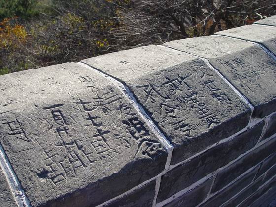 游客在北京八達嶺長城城墻頂部刻的字(2005年11月攝)。新華社發(fā)(鄭嚴攝)