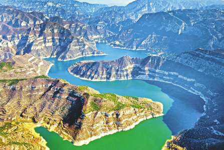 10月21日,在太原汾河二庫風(fēng)景區(qū),群山環(huán)繞于曲折迂回的水庫周圍,雄險奇秀,水清柔碧綠。如畫山水間,獨(dú)特的峽谷風(fēng)光十分壯觀。