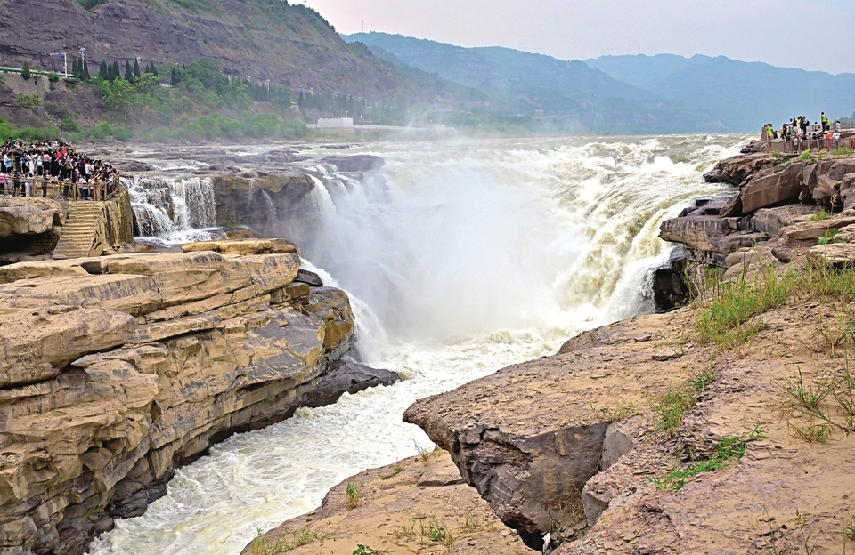 7月2日,游客在吉縣黃河壺口瀑布景區(qū)游覽觀瀑。近日,黃河進(jìn)入主汛期,受上游降雨增多和水庫(kù)調(diào)節(jié)放水影響,黃河壺口瀑布水量大增,吸引了眾多游客。