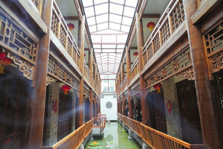 走進觀山曉筑,別有洞天。建筑風格古色古香,居中長長一池清泓,錦鯉、綠龜、卵石、荷花各自成趣。青磚墻雕既有北方莊重,水系綠植又有南方院落的靈致。房間裝修簡約古樸,窗窗都有風光。