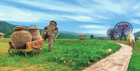 游走村內(nèi),瀟河源文化主題公園里有不少新穎物件:風動的鐵藝風車,像向日葵一般對著太陽開合;可以鍛煉用的水槍,需要用力向下壓幾下才能噴出很遠的水,用來澆灌花叢;還有會唱歌的“石頭”、用木條編制成的敲鑼大兔子……村內(nèi)樹木叢生,百草豐茂,綠葉水光交織,讓人心曠神怡,流連忘返。