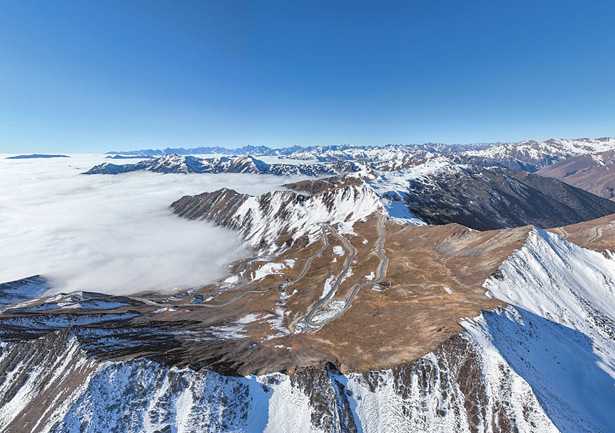 圖為12月25日拍攝的四川夾金山云海(無人機照片)。冬日的四川夾金山,云海翻騰。從高空俯瞰,連綿起伏的群山被云?;\罩,呈現(xiàn)出壯美的自然風光。