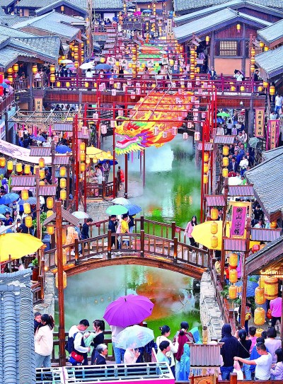 游客在湖南衡陽(yáng)南岳區(qū)“南岳里”廟會(huì)民俗美食街區(qū)游玩。新華社發(fā)