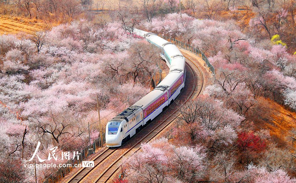2025年3月23日,居庸關(guān)長城腳下繁花似錦,北京市郊鐵路S2線列車悠然穿行其間,該線列車因途經(jīng)多處風(fēng)景名勝,被贊譽(yù)為“開往春天的列車”。張秀科攝(人民圖片網(wǎng))