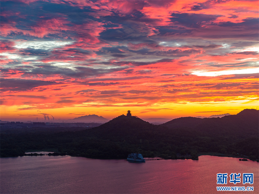 近日,安徽省池州市平天湖上空出現(xiàn)絕美朝霞景觀。新華網(wǎng)發(fā)(程爽 攝)