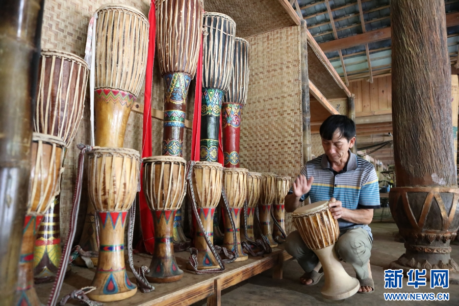 8月16日,波罕丙查看象腳鼓。新華網(wǎng)發(fā)(李云生 攝)
