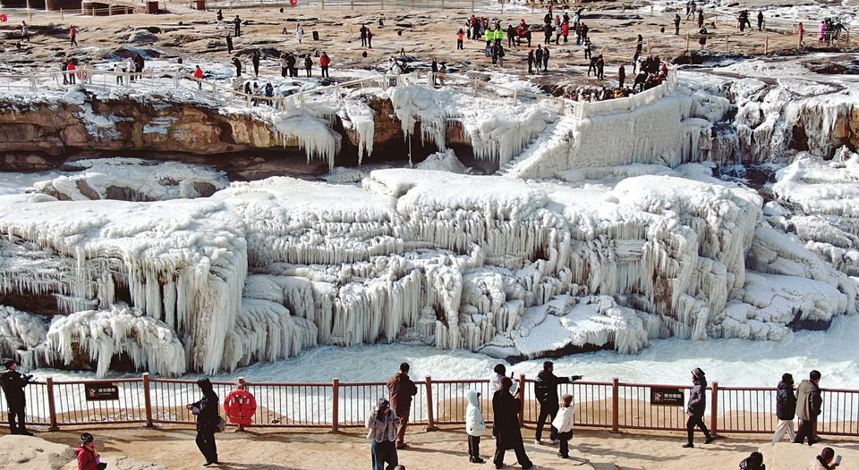 近日,受持續(xù)降溫天氣影響,黃河晉陜峽谷流凌密度持續(xù)增大,滾滾黃河水裹挾著大量流凌順流而下,在黃河壺口瀑布下游十里龍槽堆積凝結,形成流凌封河景觀。圖為1月21日,眾多游客在吉縣黃河壺口瀑布景區(qū)打卡拍照。