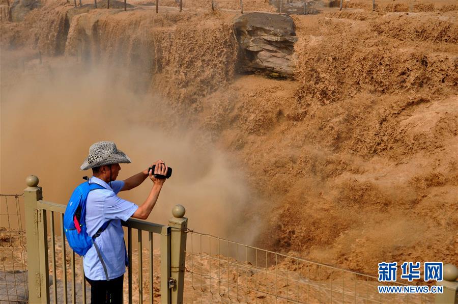 7月4日,一名游客在山西吉縣拍攝奔騰洶涌的黃河壺口瀑布。當(dāng)日,受上游降雨和水庫調(diào)節(jié)放水影響,黃河晉陜峽谷迎來入汛以來第一次漲水,壺口瀑布水量大增,再現(xiàn)壯美大瀑布,吸引了眾多游客。新華社發(fā)(呂桂明 攝)