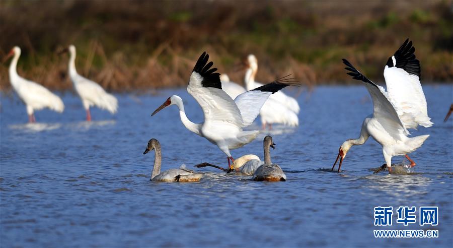 受新一輪北方冷空氣南下影響,江西鄱陽湖越冬候鳥數(shù)量激增,一年中最佳的觀鳥時節(jié)到來。江西鄱陽湖國家級自然保護區(qū)管理局近日監(jiān)測顯示,飛抵保護區(qū)的候鳥總數(shù)達(dá)到16萬只,主要包括大雁、小天鵝、白鶴、東方白鸛等。