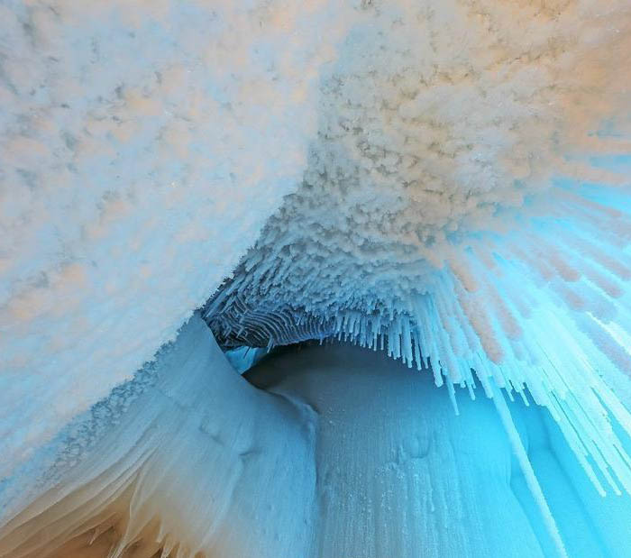 第二天一早,閆鵬和他的朋友全副武裝再次來到了這里,決心對(duì)這個(gè)洞探個(gè)究竟。他們拉了一條繩子進(jìn)入洞中,里面黑咕隆咚,腳底滑得根本沒有腳蹬的地方。后來到了一個(gè)稍微開闊的地方,站穩(wěn)腳之后,拿火把四周一看,眼前豁然開朗。他們仿佛置身于一座晶瑩的宮殿,四處都是冰的世界:冰柱、冰錐、冰瀑、冰筍、冰花。
