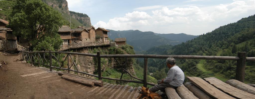 隱沒(méi)在深山老林中的王化溝分布在大約一華里長(zhǎng)的絕壁上,背依懸崖,面臨百丈深淵。全村20余戶(hù),60多口人。村西的懸崖上聳立著一塊巨石,村里人稱(chēng)之為“石人”,村后的山也因此稱(chēng)作“石人山”。村中的房子大都臨崖而建,以木柱支撐,高低錯(cuò)落,避風(fēng)向陽(yáng)。這些房子建在懸崖上看似危險(xiǎn),實(shí)則非常堅(jiān)固,至今還有清代的房子保存完好。由于地盤(pán)不足,所以沒(méi)了庭院,只有一條走廊。就是街道也只能用木料搭建,懸于空中。當(dāng)然作為農(nóng)家,牲畜的圈舍是免不了的,這里也需要精心擺布,精心建造,絕不至于讓牲畜落下深淵。