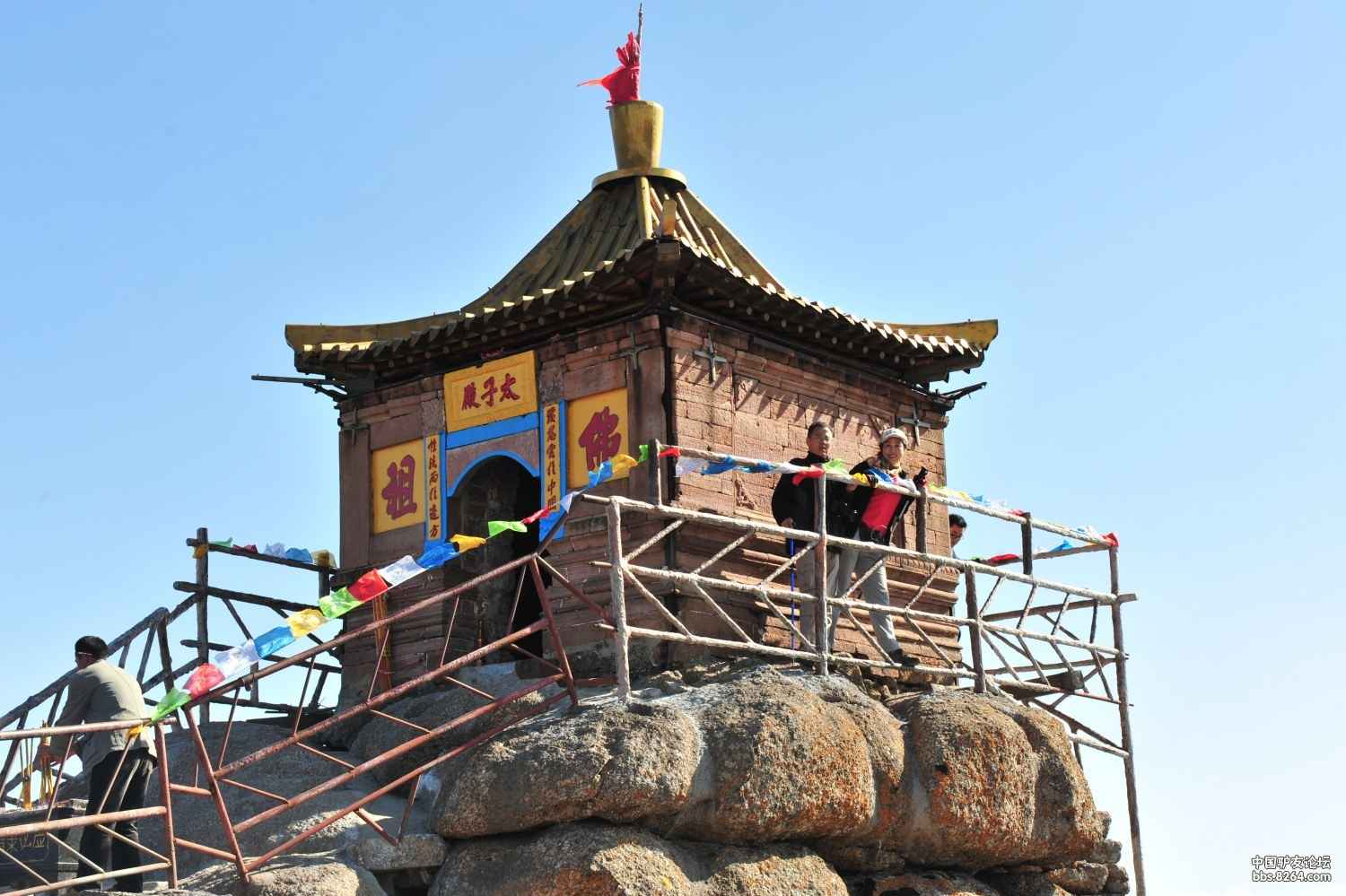 蘆芽山主峰絕頂周方僅約10平方米的石坪上,巍然托起一座正方體狀石砌建筑,這便是太子殿。三面懸崖,甚為險(xiǎn)峻。因其位居群山之極,數(shù)十里外即可看到。太子殿為石壁構(gòu)筑,殿脊有一鐵棍直指蒼穹,似為避雷特置。殿頂向四面披散,原以銅瓦鋪蓋,今已遺失。殿門北向而開,門據(jù)有石鑿“太子殿”三字赫然醒目。兩側(cè)墻壁又鑿“佛祖”二字,工整雄勁。殿門兩側(cè)石刻聯(lián)語(yǔ)系光緒年間白文良倡修該殿時(shí)書鑿,句為:復(fù)慈云于中國(guó),性潔雨于邊方。著名書法家黃克毅有詩(shī)贊太子殿景致: