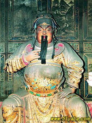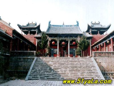 前行有午門.是一座面闊五間,單檐廡殿頂、石雕回廊的廳式建筑。周圍有石欄桿,欄板正反兩面浮雕各類圖案、人物144幅,洋洋大觀,頗有童趣。廳內(nèi)南有周倉、廖化畫像,軒昂威武。北面左右兩側(cè),彩繪著關(guān)羽戎馬一生的主要經(jīng)歷,起于桃園三結(jié)義,止于水淹七軍,只是沒有走麥城這個情節(jié),在全國關(guān)廟壁畫中都按此進行,據(jù)說這是因忌諱關(guān)羽自高自大而被殺,終于造成蜀國的覆滅而隱去的。穿過午門,經(jīng)“山海鐘靈”坊、御書樓,便是關(guān)帝廟主體建筑崇寧殿。