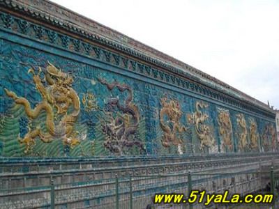 馳名中外的大同九龍壁,在我國現(xiàn)存最享盛名的三座九龍壁中,是建筑年代最早、尺度最大、而又最富藝術(shù)魅力的一座。(另兩座在北京,一座在北京北海公園,一座在北京故宮皇極門前,均建于清乾隆時(shí)代。較大同九龍壁要晚三百五十至四百年。)