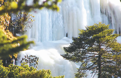 在著名的三疊泉瀑布前,原本飛流直下三千尺的壯觀(guān)場(chǎng)面不見(jiàn)了,呈現(xiàn)在游客眼前的是一條巨大的玉帶倒掛在崖壁上。險(xiǎn)峻的石巖上,已是懸崖百丈冰,不少參差不齊的冰凌懸掛在石巖上,往日桀驁不馴的瀑布此時(shí)變得溫馴了。整個(gè)山澗白茫茫一片,被晶瑩剔透的冰柱所覆蓋,銀裝素裹,氣勢(shì)恢宏,場(chǎng)面極為壯觀(guān)。此時(shí)雖聽(tīng)不到往昔轟隆隆的瀑布聲,但能一睹這懸掛在石崖上的冰瀑,卻是別有一番景致。