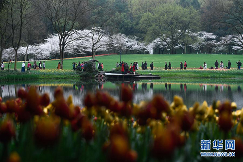 3月19日,市民和游客在太子灣公園游覽。近日,浙江省杭州市西子湖畔太子灣公園里的郁金香、櫻花競相綻放,吸引大批游客和市民前來觀賞。 新華社記者 黃宗治 攝