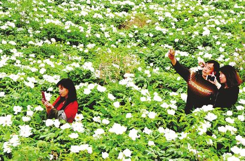 4月11日,在垣曲縣古城鎮(zhèn)允嶺村的牡丹園,游人正在賞花自拍。該村地處黃河水庫邊,近年來圍繞鄉(xiāng)村游發(fā)展觀光農(nóng)業(yè),先后建起了百畝牡丹基地、百畝油蔬基地和千畝石榴基地,每到盛花期,吸引四面八方的游客賞花觀景。(崔松良 攝)