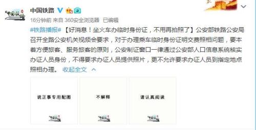 4月19日,《新華每日電訊》刊登《辦臨時(shí)身份證坐火車(chē),非得拍照證明自己是自己?》引起社會(huì)廣泛關(guān)注。公安部鐵路公安局有關(guān)負(fù)責(zé)人回應(yīng)稱(chēng),已要求所有辦證單位和人員不得再要求辦證人員提供照片。