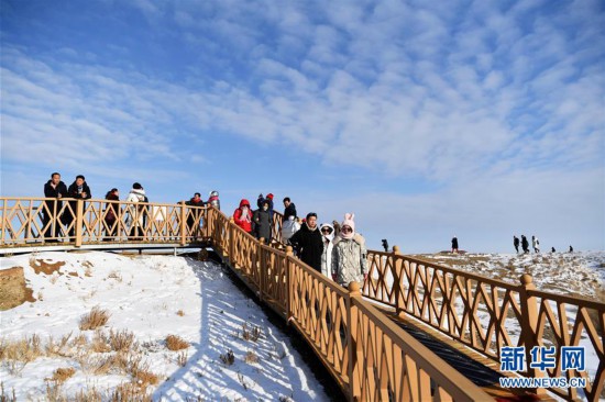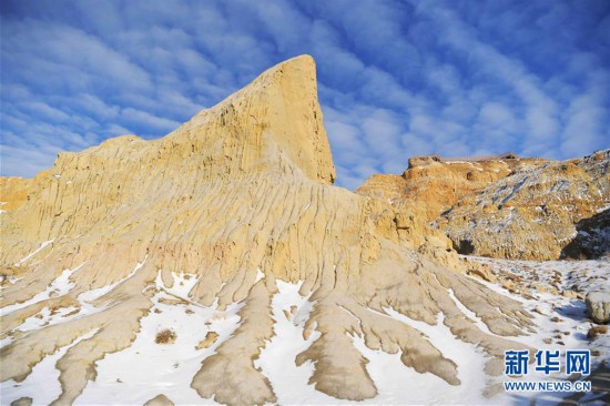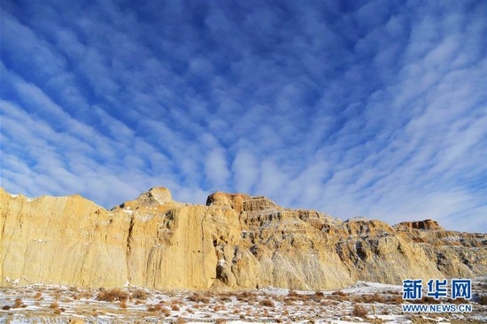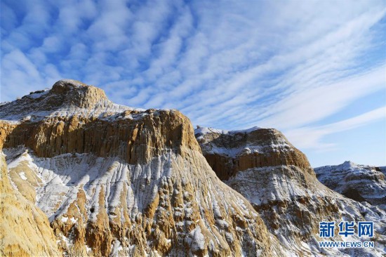 11月26日拍攝的新疆福海縣烏倫古湖海上魔鬼城景區(qū)美景。 福海縣烏倫古湖海上魔鬼城景區(qū)位于新疆阿勒泰地區(qū)福??h吉力湖東岸,有著獨(dú)特的雅丹地貌和水域景觀,是當(dāng)?shù)刂穆糜蝿俚亍?新華社記者 沙達(dá)提 攝