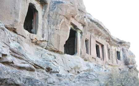進(jìn)入寺院抬頭仰望,距現(xiàn)地表高約10米的山體上由北向南排列著九座石窟??傮w特征皆平面方形,窟頂上部外立面存有窟檐橡孔。沿山崖堆積的土丘登高看到,每窟面積約為2平方米,四壁垂直,頂部為平頂或略帶弧度。第一、三、五窟門楣雕有火焰紋裝飾,門楣內(nèi)雕飛天或花卉,門兩側(cè)設(shè)方形石柱或八棱束蓮柱。一至六窟平面呈長(zhǎng)方形,平頂,四壁平直;七至九窟呈長(zhǎng)方形,拱券頂;中間一孔入口兩側(cè)還刻有石雕小獸,造型生動(dòng)。9窟中除第8窟為未完工的窟室和第7窟推測(cè)為僧房窟外,余下的窟俱為佛殿窟。窟內(nèi)三面石壁上都刻有佛像,設(shè)低壇。四壁三龕,每龕一佛二菩薩或一佛二弟子,造像面相豐潤(rùn)、頤頰飽滿。雖年久失修,風(fēng)化嚴(yán)重,但仍能從中領(lǐng)略幾分豪邁灑脫的大唐風(fēng)韻。三至六窟外壁存摩崖碑3通,均為螭首,碑文漫漶不清。據(jù)摩崖碑上“……歲次丁丑七月辛酉朔十五日乙亥建立”字跡記載,雕造于唐儀鳳二年(公元677年)。