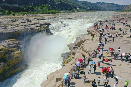6月28日,游客在吉縣黃河壺口瀑布景區(qū)游覽觀瀑。仲夏時(shí)節(jié),隨著上游降雨增多,位于晉陜兩省交界的黃河壺口瀑布水量明顯增大,滾滾而來(lái)的黃河水如萬(wàn)馬奔騰,氣勢(shì)磅礴,吸引來(lái)眾多游客。