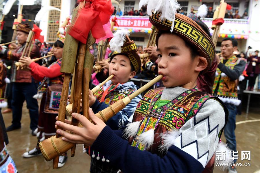 2月7日,廣西融水苗族自治縣安太鄉(xiāng)苗族群眾開展傳統(tǒng)的“打同年”民俗活動(dòng)。當(dāng)?shù)財(cái)?shù)百名苗族同胞與游客們歡聚一堂,一起開展對歌、蘆笙踩堂、文藝晚會(huì)等活動(dòng),歡慶新春佳節(jié)。 “打同年”是融水苗族村寨的一種民俗,即友好村寨之間的拜年聯(lián)歡活動(dòng)。新華社記者 李斌 攝