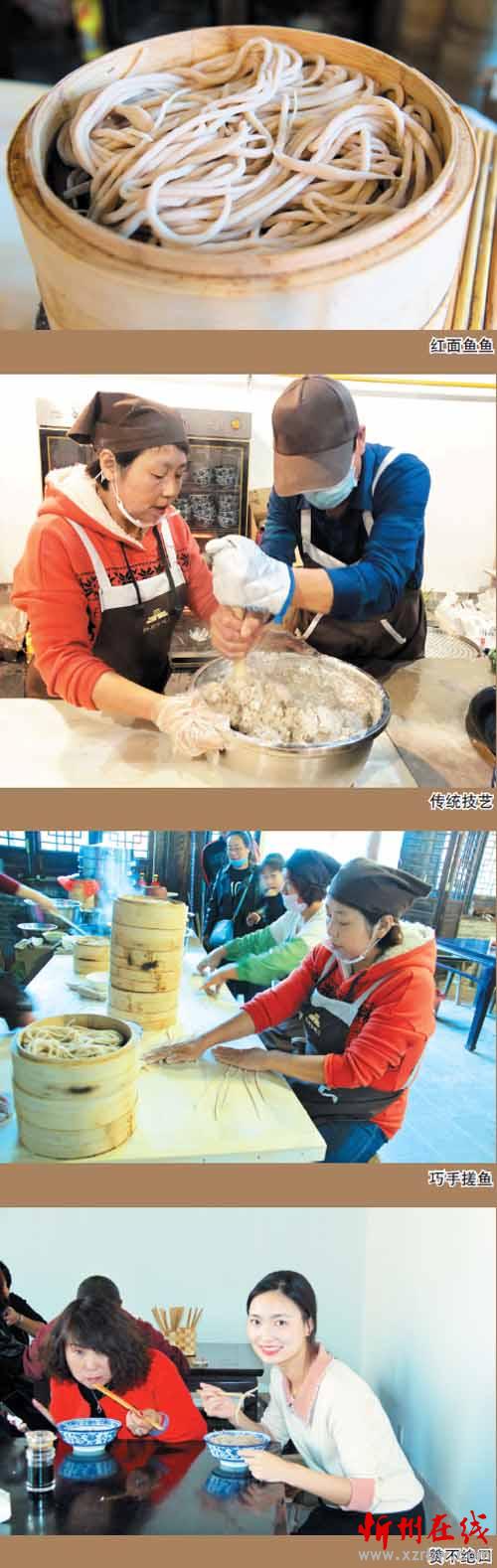這家店的女主人叫康秀蘭,今年51歲,忻府區(qū)豆羅鎮(zhèn)韓溝村人。秀蘭從小勤快,幫助母親洗鍋?zhàn)鲲?,學(xué)搓魚魚。18歲時(shí)便遠(yuǎn)近聞名,掌握了搓魚魚的好手藝。在今年忻州古城招商比賽入圍的6家店鋪中,秀蘭的小店脫穎而出,奪得第一名,拿到了開門店的資格。眼下夫妻二人經(jīng)營著兩間大的門臉兒,小籠屜蒸魚魚,臊子有鮮肉蘑菇、西紅柿和老酸菜湯,食客們可根據(jù)自己的喜好選擇。他們兩口子既當(dāng)老板又是廚師。在食客多時(shí)臨時(shí)雇幾個(gè)幫工,小生意做得風(fēng)生水起??敌闾m告訴筆者,自開張以來食客不斷增加,國慶節(jié)假期期間一天的最高銷售紀(jì)錄是賣出200多籠紅面魚魚。