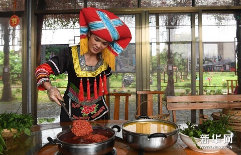 3月25日,在廣西上林縣巷賢鎮(zhèn),一名壯族村民在準備做五色糯米飯。新華社記者 陸波岸 攝