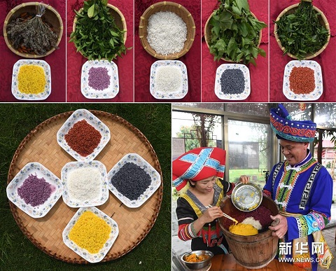 上五圖:4種不同植物及其色素染成的糯米和原色糯米;下左圖:4種不同植物色素染成的糯米和原色糯米;下右圖:在廣西上林縣巷賢鎮(zhèn),兩名壯族村民在查看一桶剛剛蒸熟的五色糯米飯(拼版圖片,3月25日攝)。 每年“壯族三月三”到來之際,廣西的壯族同胞都有蒸制五色糯米飯迎接節(jié)日的習俗,以祈禱五谷豐登,五福臨門。這些五色糯米飯,主要采用天然植物萃取色素,將糯米分別浸泡到紫、黃、紅、黑4種不同植物色素的水里,充分染色后,與原色糯米一起蒸熟而成。色澤鮮艷、清香誘人的五色糯米飯,是“壯族三月三”接待來客時必不可少的傳統(tǒng)美食。新華社記者 陸波岸 攝