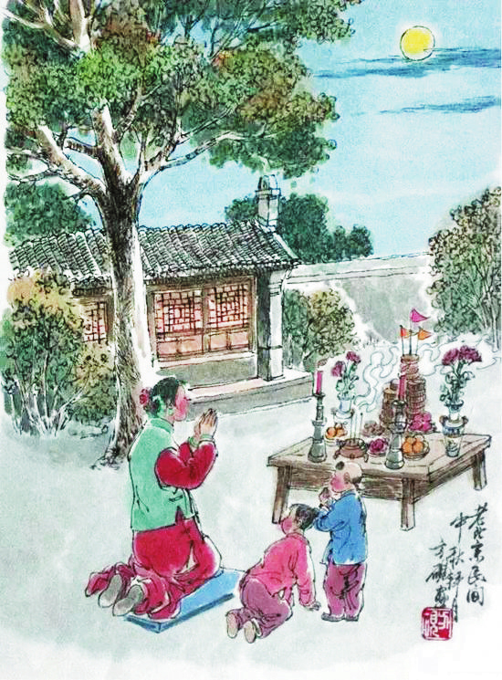 “中秋月。月到中秋偏皎潔?!辟p月是中秋節(jié)的重要習(xí)俗,我國民間的中秋賞月活動約始于魏晉時期,盛于唐朝,當(dāng)時許多名篇佳作中都有詠月的詩句。北宋時期,以賞月活動為中心的中秋節(jié)已成為普遍的民俗節(jié)日,然而與唐代不同的是,宋代關(guān)于賞月的作品多是感物傷懷,以陰晴圓缺喻人情世態(tài)。宋代的中秋夜是不眠之夜,夜市通宵營業(yè),游人絡(luò)繹不絕,《東京夢華錄》中載:“中秋節(jié)前,諸店皆賣新酒,貴家結(jié)飾臺榭,民家爭占酒樓玩月,笙歌遠聞千里,嬉戲連坐至?xí)??!币恍┑胤缴踔亮鱾鳌爸星镆乖酵硭介L壽”的說法,于是有了守夜的習(xí)俗。守夜時,家里長輩通常會給小孩講關(guān)于月亮的故事,如嫦娥奔月、吳剛伐桂等,孩子們個個聽得津津有味。