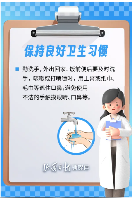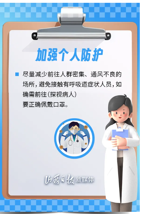 冬季雨雪增多,氣溫下降,新冠病毒、流感病毒、肺炎支原體等多病原引起的呼吸道傳染病風(fēng)險(xiǎn)上升。 為保護(hù)公眾身體健康,有效應(yīng)對傳染病疫情,山西省衛(wèi)健委、省疾控局溫馨提示,建議公眾加強(qiáng)個(gè)人防護(hù),科學(xué)佩戴口罩,保持良好衛(wèi)生習(xí)慣,健康安全度過這個(gè)冬季。
