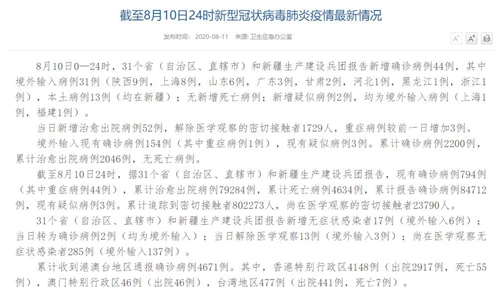 情況顯示,截至8月10日24時,據(jù)31個?。ㄗ灾螀^(qū)、直轄市)和新疆生產(chǎn)建設(shè)兵團報告,現(xiàn)有確診病例794例(其中重癥病例44例),累計治愈出院病例79284例,累計死亡病例4634例,累計報告確診病例84712例,現(xiàn)有疑似病例3例。累計追蹤到密切接觸者802273人,尚在醫(yī)學(xué)觀察的密切接觸者23790人。