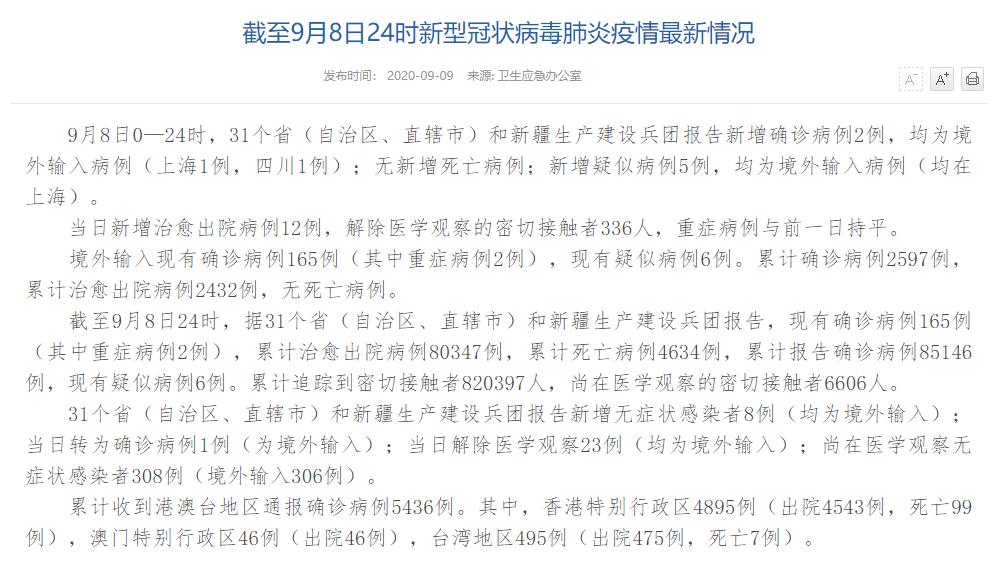 | 國家衛(wèi)健委:9月8日新增確診病例2例 均為境外輸入病例 |