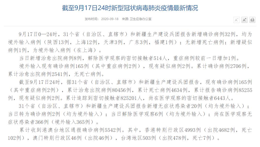 人民網(wǎng)北京9月18日電(董童)國家衛(wèi)生健康委于今日在官網(wǎng)發(fā)布的《截至9月17日24時新型冠狀病毒肺炎疫情最新情況》(以下簡稱“情況”)提出,9月17日0—24時,31個省(自治區(qū)、直轄市)和新疆生產(chǎn)建設兵團報告新增確診病例32例,均為境外輸入病例(陜西13例,上海12例,天津3例,廣東3例,福建1例);無新增死亡病例;新增疑似病例1例,為境外輸入病例(在上海)。當日新增治愈出院病例8例,解除醫(yī)學觀察的密切接觸者514人,重癥病例較前一日增加1例。