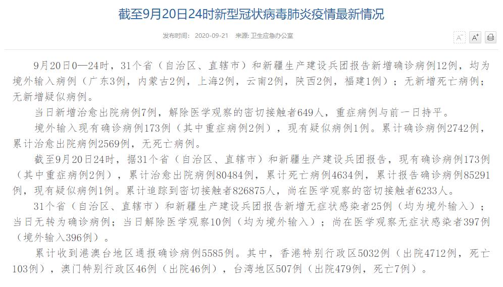 人民網(wǎng)北京9月21日電(董童)國家衛(wèi)生健康委于今日在官網(wǎng)發(fā)布的《截至9月20日24時新型冠狀病毒肺炎疫情最新情況》(以下簡稱“情況”)提出,9月20日0—24時,31個省(自治區(qū)、直轄市)和新疆生產(chǎn)建設(shè)兵團報告新增確診病例12例,均為境外輸入病例(廣東3例,內(nèi)蒙古2例,上海2例,云南2例,陜西2例,福建1例);無新增死亡病例;無新增疑似病例。當(dāng)日新增治愈出院病例7例,解除醫(yī)學(xué)觀察的密切接觸者649人,重癥病例與前一日持平。
