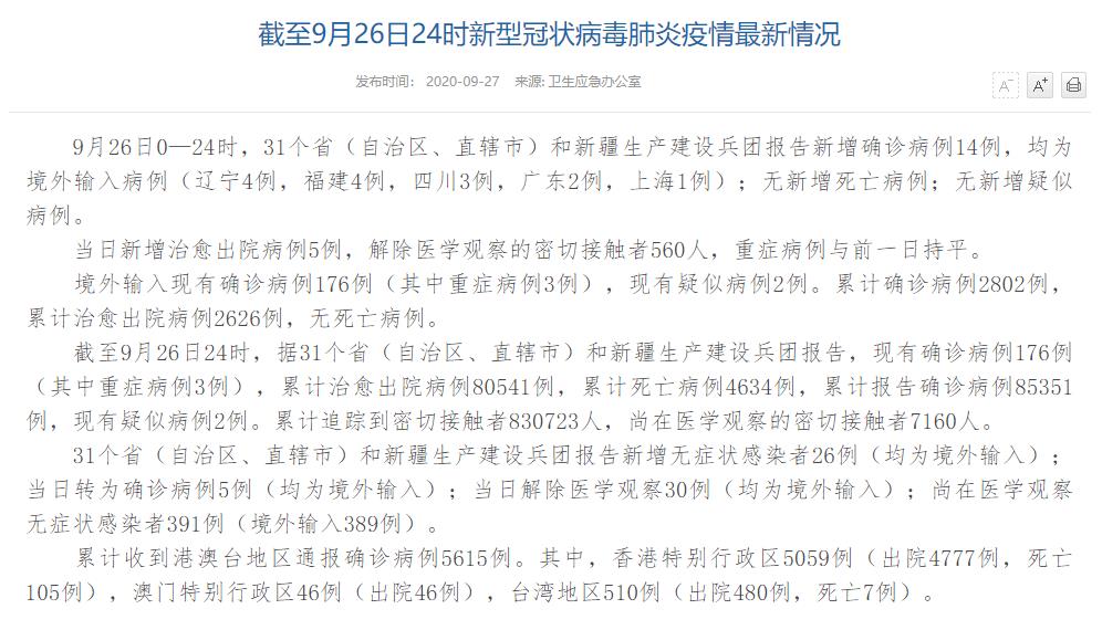 人民網(wǎng)北京9月27日電(董童)國(guó)家衛(wèi)生健康委于今日在官網(wǎng)發(fā)布的《截至9月26日24時(shí)新型冠狀病毒肺炎疫情最新情況》(以下簡(jiǎn)稱“情況”)提出,9月26日0—24時(shí),31個(gè)?。ㄗ灾螀^(qū)、直轄市)和新疆生產(chǎn)建設(shè)兵團(tuán)報(bào)告新增確診病例14例,均為境外輸入病例(遼寧4例,福建4例,四川3例,廣東2例,上海1例);無新增死亡病例;無新增疑似病例。當(dāng)日新增治愈出院病例5例,解除醫(yī)學(xué)觀察的密切接觸者560人,重癥病例與前一日持平。