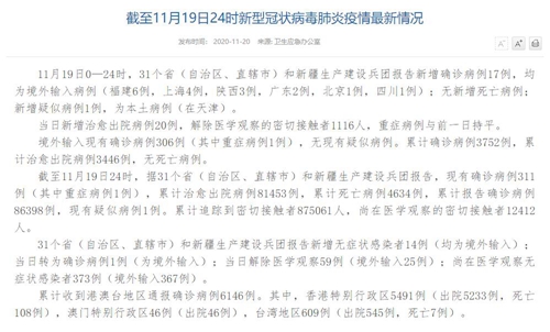 人民網(wǎng)北京11月20日電(董童)國(guó)家衛(wèi)生健康委于今日在官網(wǎng)發(fā)布的《截至11月19日24時(shí)新型冠狀病毒肺炎疫情最新情況》(以下簡(jiǎn)稱“情況”)提出,11月19日0—24時(shí),31個(gè)?。ㄗ灾螀^(qū)、直轄市)和新疆生產(chǎn)建設(shè)兵團(tuán)報(bào)告新增確診病例17例,均為境外輸入病例(福建6例,上海4例,陜西3例,廣東2例,北京1例,四川1例);無新增死亡病例;新增疑似病例1例,為本土病例(在天津)。當(dāng)日新增治愈出院病例20例,解除醫(yī)學(xué)觀察的密切接觸者1116人,重癥病例與前一日持平。