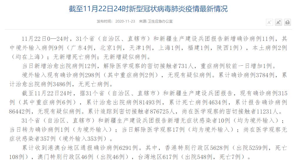 情況顯示,截至11月22日24時,據(jù)31個?。ㄗ灾螀^(qū)、直轄市)和新疆生產(chǎn)建設兵團報告,現(xiàn)有確診病例315例(其中重癥病例6例),累計治愈出院病例81493例,累計死亡病例4634例,累計報告確診病例86442例,無現(xiàn)有疑似病例。累計追蹤到密切接觸者876725人,尚在醫(yī)學觀察的密切接觸者11231人。