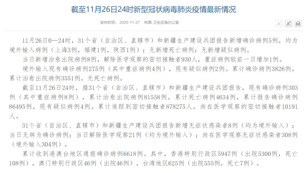 人民網(wǎng)北京11月27日電(董童)國家衛(wèi)生健康委于今日在官網(wǎng)發(fā)布的《截至11月26日24時新型冠狀病毒肺炎疫情最新情況》(以下簡稱“情況”)指出,11月26日0—24時,31個省(自治區(qū)、直轄市)和新疆生產(chǎn)建設(shè)兵團報告新增確診病例5例,均為境外輸入病例(上海3例,福建1例,陜西1例);無新增死亡病例;無新增疑似病例。當日新增治愈出院病例8例,解除醫(yī)學觀察的密切接觸者930人,重癥病例較前一日增加1例。