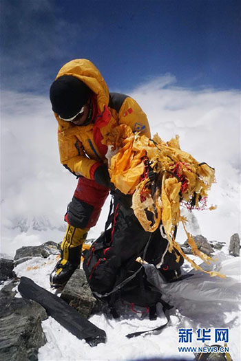 2018年5月,次仁旦達(dá)在珠穆朗瑪峰7500米的高度撿垃圾。 新華社發(fā)
