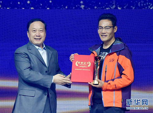 1月18日,“環(huán)保衛(wèi)士”次仁旦達(dá)(右)上臺(tái)領(lǐng)獎(jiǎng)。 當(dāng)日,新華社主辦的“中國(guó)網(wǎng)事·感動(dòng)2018”年度頒獎(jiǎng)典禮在中國(guó)傳媒大學(xué)舉行,10位“草根”成為舞臺(tái)上最閃亮的明星。新華社記者 李賀 攝 “環(huán)保衛(wèi)士”次仁旦達(dá):頂著每秒20米的風(fēng)速,冒著零下50攝氏度的嚴(yán)寒,拾起沿途遺棄在珠峰上的各種廢棄物品。從一人干到帶動(dòng)多人干,在人類徒步能夠到達(dá)的極限,踐行環(huán)保。