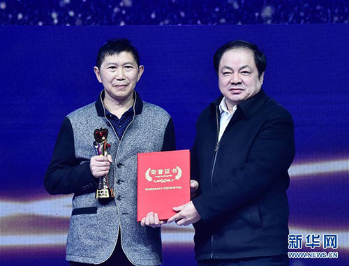 1月18日,“癌癥支書(shū)”余啟良(左)上臺(tái)領(lǐng)獎(jiǎng)。當(dāng)日,新華社主辦的“中國(guó)網(wǎng)事·感動(dòng)2018”年度頒獎(jiǎng)典禮在中國(guó)傳媒大學(xué)舉行,10位“草根”成為舞臺(tái)上最閃亮的明星。新華社記者 李賀 攝 “癌癥支書(shū)”余啟良:55歲,一個(gè)肺癌晚期的患者,懷著一顆對(duì)黨忠誠(chéng)的初心,一心為民的情懷,忘我?jiàn)^戰(zhàn)在石阡脫貧攻堅(jiān)第一線。