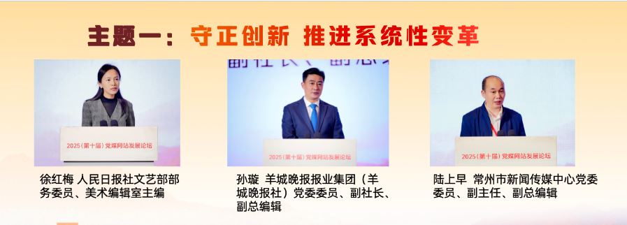 在“守正創(chuàng)新 推進(jìn)系統(tǒng)性變革”主題研討環(huán)節(jié),人民日?qǐng)?bào)社文藝部部務(wù)委員、美術(shù)編輯室主編徐紅梅,羊城晚報(bào)報(bào)業(yè)集團(tuán)(羊城晚報(bào)社)黨委委員、副社長(zhǎng)、副總編輯孫璇,常州市新聞傳媒中心黨委委員、副主任、副總編輯陸上早分別作主旨發(fā)言,介紹了各自領(lǐng)域推進(jìn)系統(tǒng)性變革、發(fā)展新時(shí)代中國(guó)特色社會(huì)主義文化的實(shí)踐與探索。徐紅梅表示,“每日讀畫”采取“AI+美術(shù)”“微視頻+夜讀”的形式,堅(jiān)持“讀準(zhǔn)、讀細(xì)、讀新、讀美”,讓AI成為深入畫境、開啟古今對(duì)話的共創(chuàng)者,以動(dòng)態(tài)轉(zhuǎn)譯、意境擴(kuò)展、流程再造、視聽融合開發(fā)美術(shù)融媒的敘事潛能,深入挖掘中華文明賡續(xù)傳承的基因密碼,成為探索主流媒體系統(tǒng)性變革的微觀樣本。孫璇表示,羊城晚報(bào)全面啟動(dòng)系統(tǒng)性變革,以做強(qiáng)媒體、文化、數(shù)據(jù)、產(chǎn)業(yè)四個(gè)戰(zhàn)略板塊為重點(diǎn),把“技術(shù)賦能”嵌入系統(tǒng)性變革各關(guān)鍵板塊,積極增強(qiáng)文化傳播、促進(jìn)文化交流和繁榮文化生產(chǎn)。陸上早表示,常州借“蘇超”東風(fēng),走出城市轉(zhuǎn)型與能級(jí)躍升之路。改革的推進(jìn)需聚焦六大方向:組織體系化,內(nèi)容精品化,傳播移動(dòng)化,技術(shù)現(xiàn)代化,分配績(jī)效化,干部年輕化。